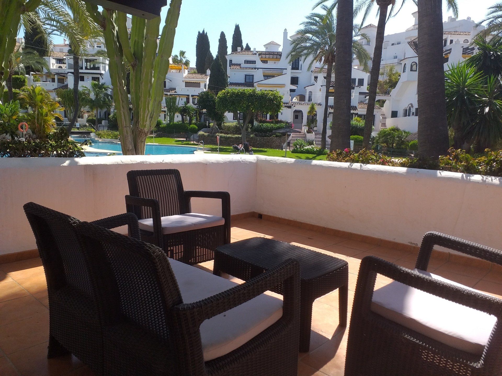 Casual furniture and coffee table. A few short steps away from the main swimming pool.